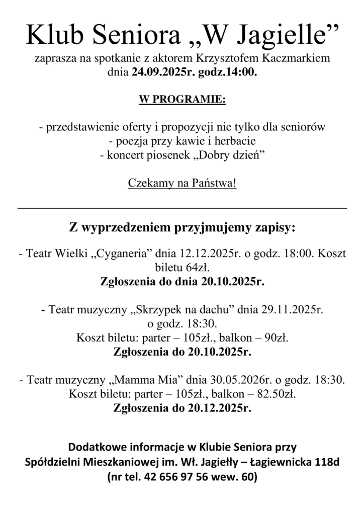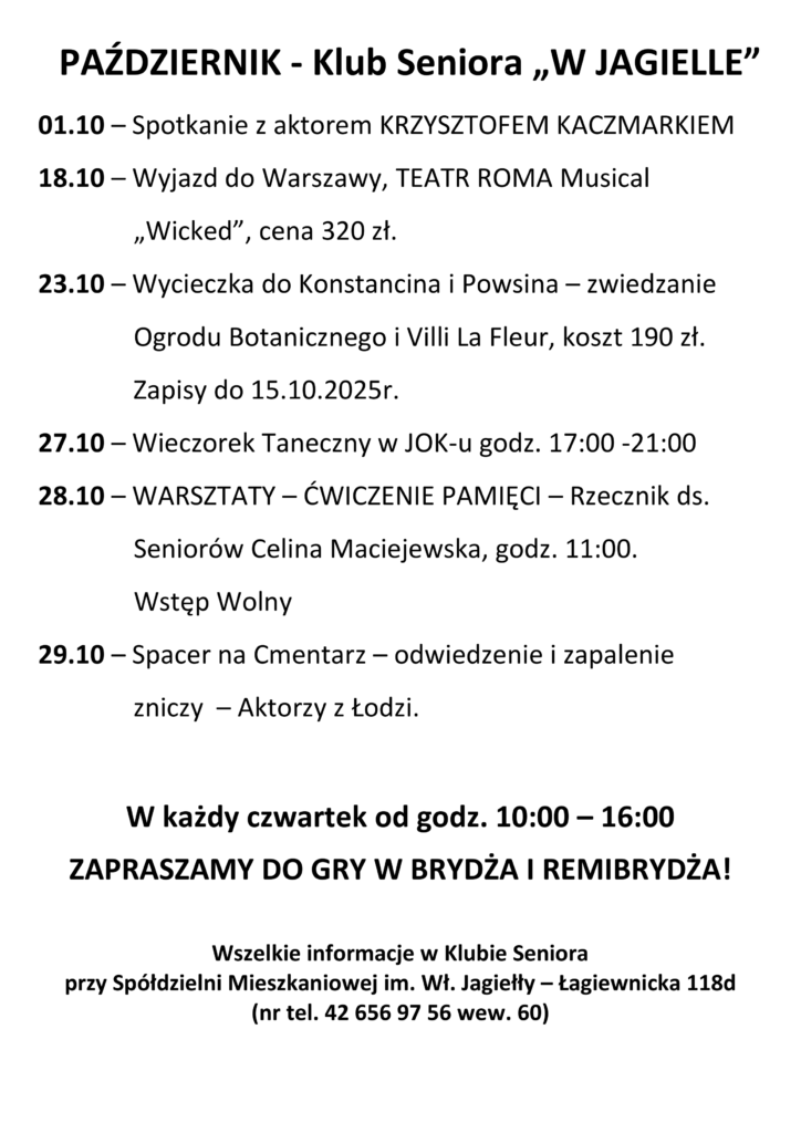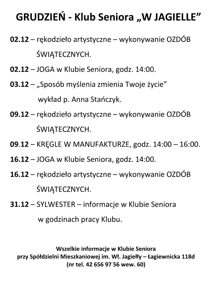 Klub Seniora Spółdzielni Mieszkaniowej im.Władysława Jagiełły czynny jest: