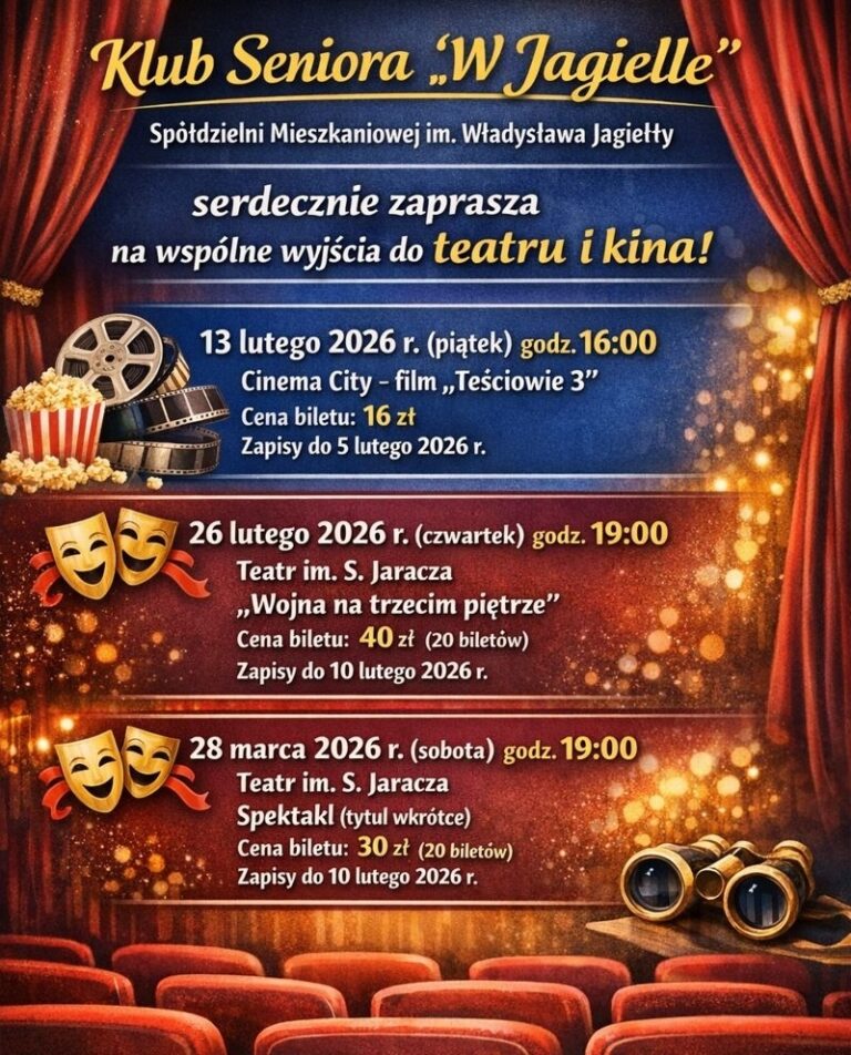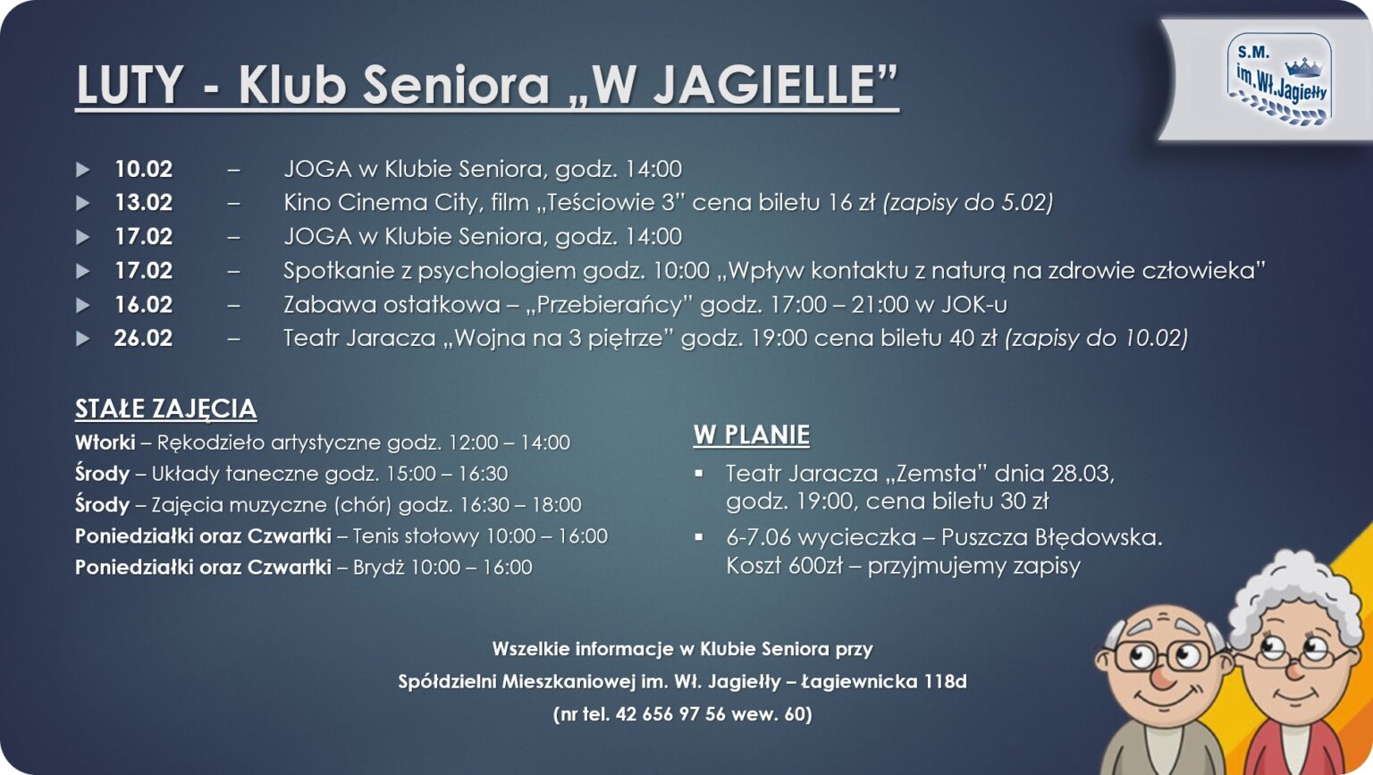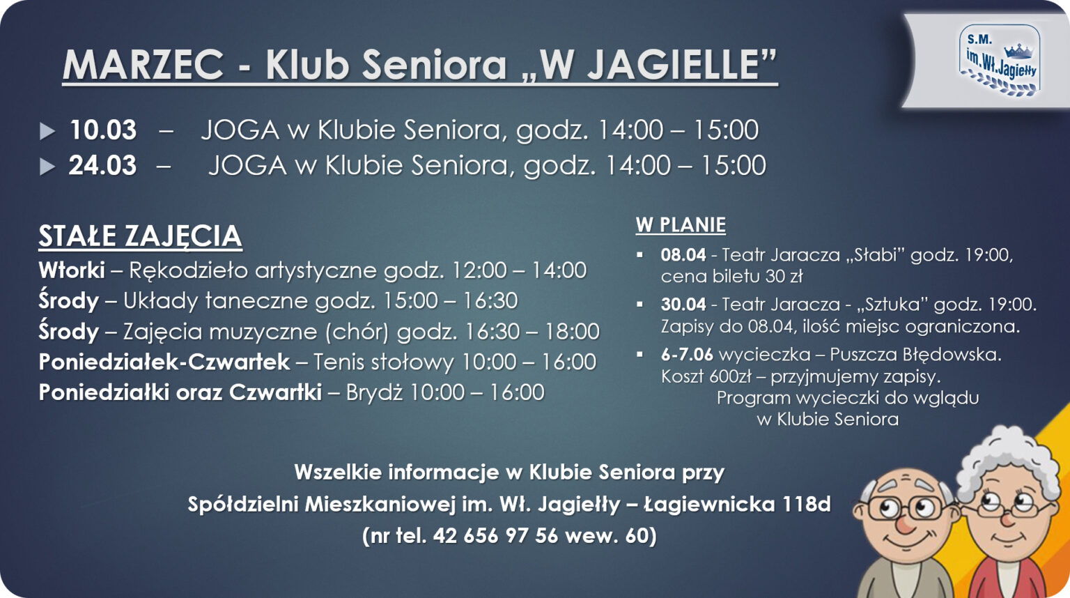 Klub Seniora Spółdzielni Mieszkaniowej im. Władysława Jagiełły czynny jest: